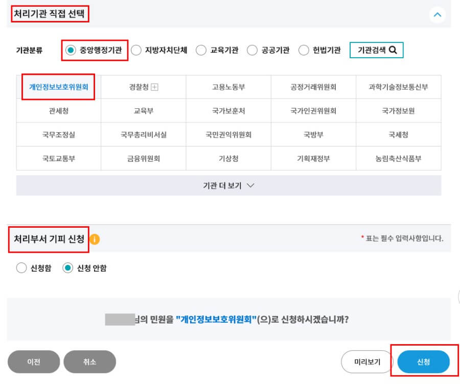 처리 기관을 직접 선택한 후 중앙 행정 기관을 선택하고 원하는 기관을 선택한 뒤, 처리 부서 기피 신청에 신청하지 않음에 체크하고 신청 버튼을 클릭하면 신청이 완료됩니다.