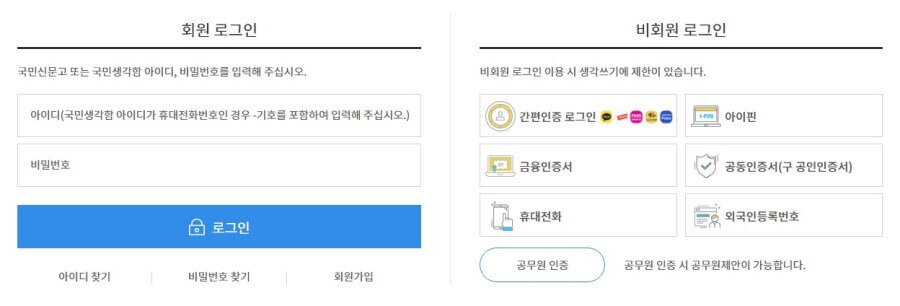 회원 로그인과 비회원 로그인이 제공되며, 민원신청하기를 선택할 경우 비회원으로도 민원을 신청할 수 있습니다.