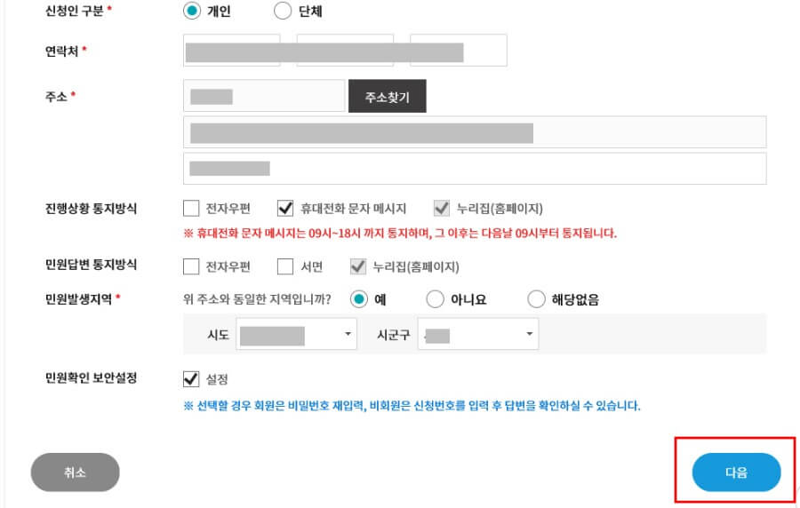 신청자의 개인정보를 입력한 후, "다음" 버튼을 클릭합니다.