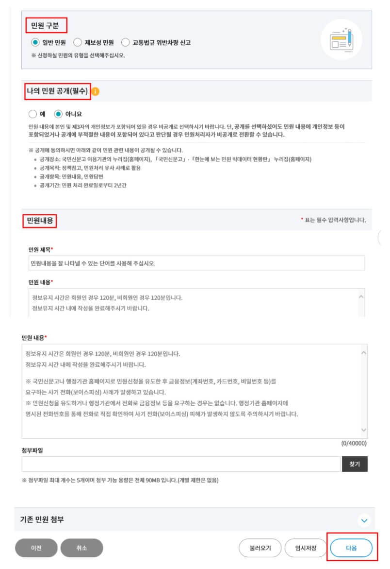 일반 민원, 제보성 민원, 그리고 교통법규 위반차량 신고 중에서 해당하는 민원을 선택하시고, 나의 민원을 공개할지 여부에도 체크하신 후, 민원 제목과 민원 내용을 입력하신 뒤에 다음 버튼을 클릭합니다.