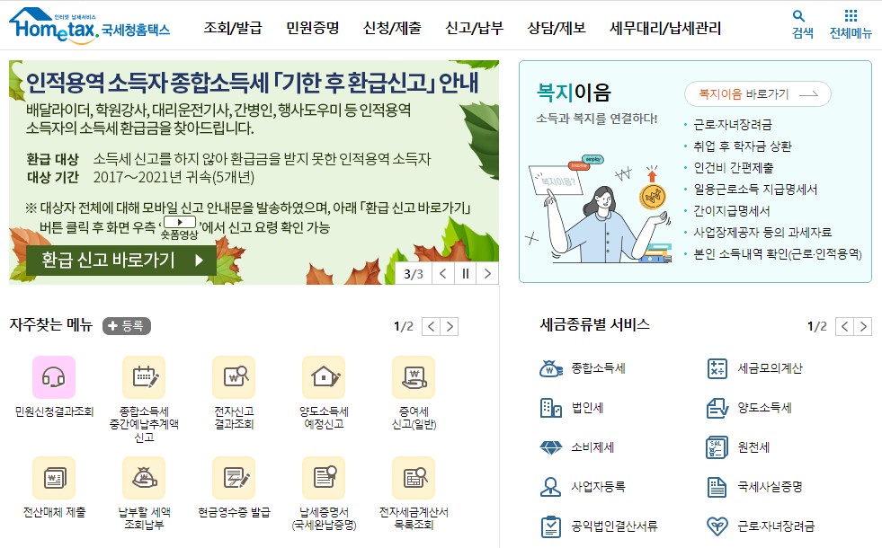 자주 찾는 서비스에는 국세청 홈택스 홈페이지에 접속하는 분들이 많이 이용하는 서비스를 모아 놓았다고 보시면 됩니다.