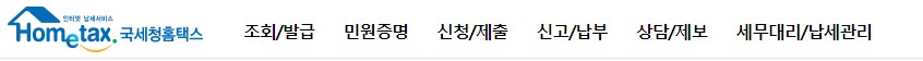 국세청 홈택스에는 메뉴에는 조회/발급, 민원증명, 신청/제출, 신고/납부등의 서비스를 제공하고 있습니다.