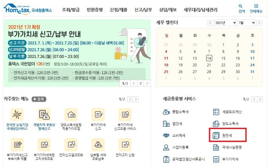 국세청 홈택스 홈페이지에 접속을 하고 오른쪽 화면 아래에 보시면 [세금 종류별 서비스] 메뉴가 보이는데 [원천세]를 클릭합니다.