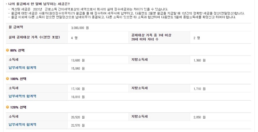 월 급여액, 전체 공제대상 가족 수, 공제대상 7세 이상 20세 이하 자녀수를 설정을 하고 [조회하기]를 누르면 내가 내야 하는 근로소득세 결과를 아래와 같이 확인할 수 있습니다.