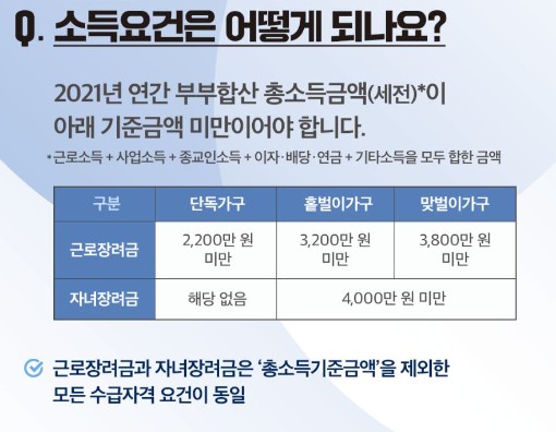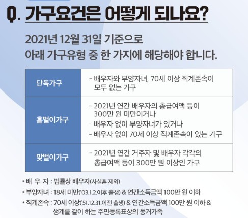 단독가구의 경우 2,200만 원 미만, 홑벌이 가구는 3, 200만 원 미만, 맞벌이 가구는 부부 총급여액이 3천800만 원 미만이어야만 신청이 가능하고 지급액을 받을 수 있습니다.