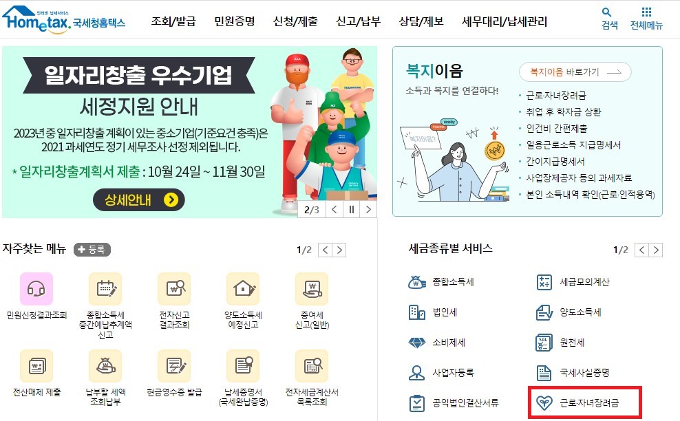 2. 세금종류별 서비스 메뉴에서 근로/자녀 장려금 클릭하기