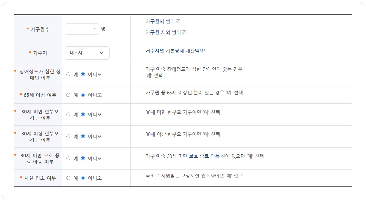 기초생활수급자 모의계산을 휘새서는 기본정보를 먼저 입력해야 합니다. 가구원수, 거주지, 장애여부, 나이, 한부모 가구 여부, 아동 여부등을 작성해야 합니다.