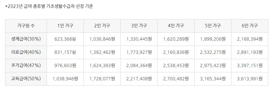 보건복지부의 2023년 기초생활수급자 자격요건 가운데 기준 중위소득 50%이하의 교육급여, 기준 중위소득의 47% 이하의 주거급여, 40%이하의 의료급여, 30%이하는 생계급여를 지급을 하고 주거급여가 46%에서 47%로 완화되었습니다.