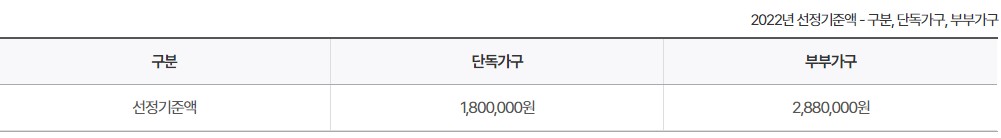 3. 22년 기준 단독가구 소득인정액이 월 180만원, 부부가구 288만원 이하