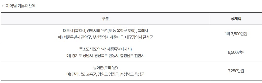 기본재산액은 대소시 1억 3천 5백만원, 중소도시 8천5백만원, 농어촌 7천 2백 50만원을 공제해 줍니다.