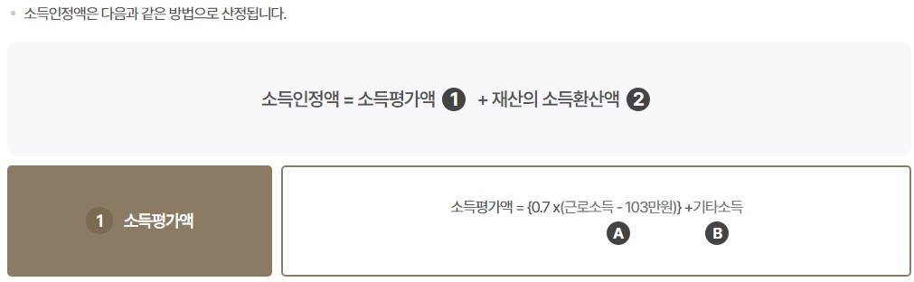 소득평가액 = { 0.7 ×(근로소득 - 103만 원)} + 기타 소득