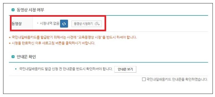동영상 시청 여부란에서 [동영상 시청하기]를 눌러 시청하고 국민내일배움카드 안내문에 체크합니다.