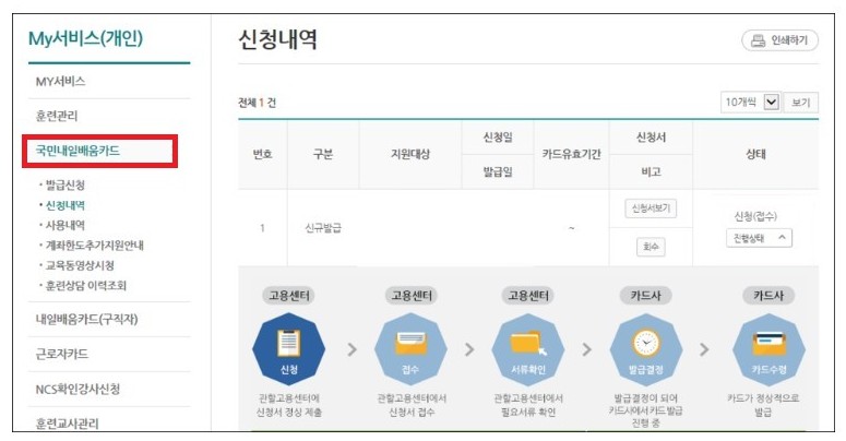 모든 과정을 완료하고 [My 서비스]에 들어가시면 국민내일배움카드 신청내역을 확인할 수 있습니다.