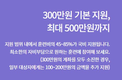 내일배움카드 발급 시 지원되는 기본 금액은 300만 원이며, 추가 교육 대상자일 경우 200만 원을 추가해 최대 500만 원까지 지원을 받을 수 있습니다. 또한 지원 범위 내에서 훈련비의 45 ~ 85%를 국비로 지원을 합니다. 전문상담사와 상담 후 개인별 직업 훈련을 선택할 수 있으며, 남은 잔액과 훈련 이력을 실시간으로 확인할 수 있습니다.