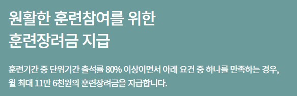 내일배움카드 신청자격이 갖추어지면 원활한 훈련 참여를 위한 훈련장려금도 방을 수 있으며, 80% 이상 수강을 하고 일정 요건을 충족하면 월 최대 11만 6000원까지 받을 수 있습니다.