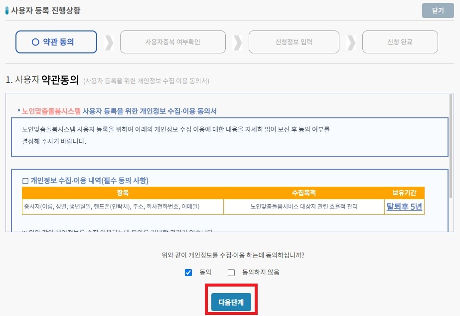 사용자 약관 동의체 체크를 하고 [다음단계]를 눌러주세요.