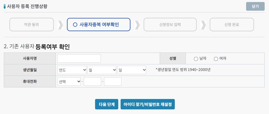 [다음단계]를 누르면 사용자중복 여부확인을 위해 사용자명, 성별, 생년월일, 휴대전화 번호를 입력하고 [다음 단계]를 눌러주세요.