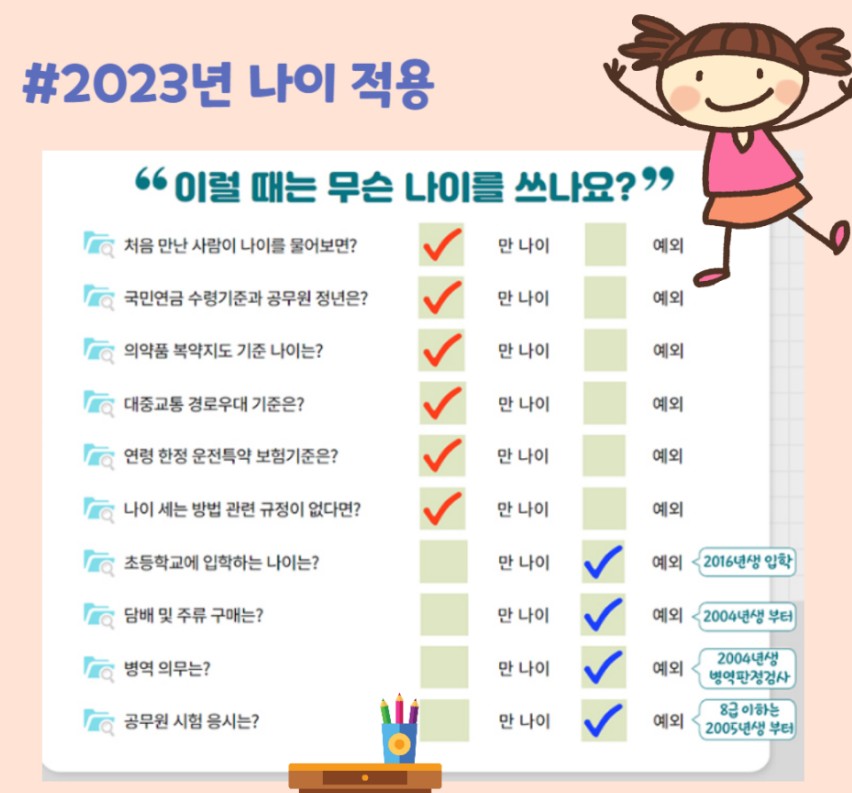 국민연금, 대중교통 경로우대 기준, 운전특약등은 만나이를 적용하고 초등학교 입학, 병역의무, 공무원 시험 응시는 예외로 됩니다.