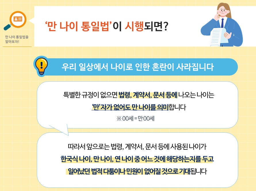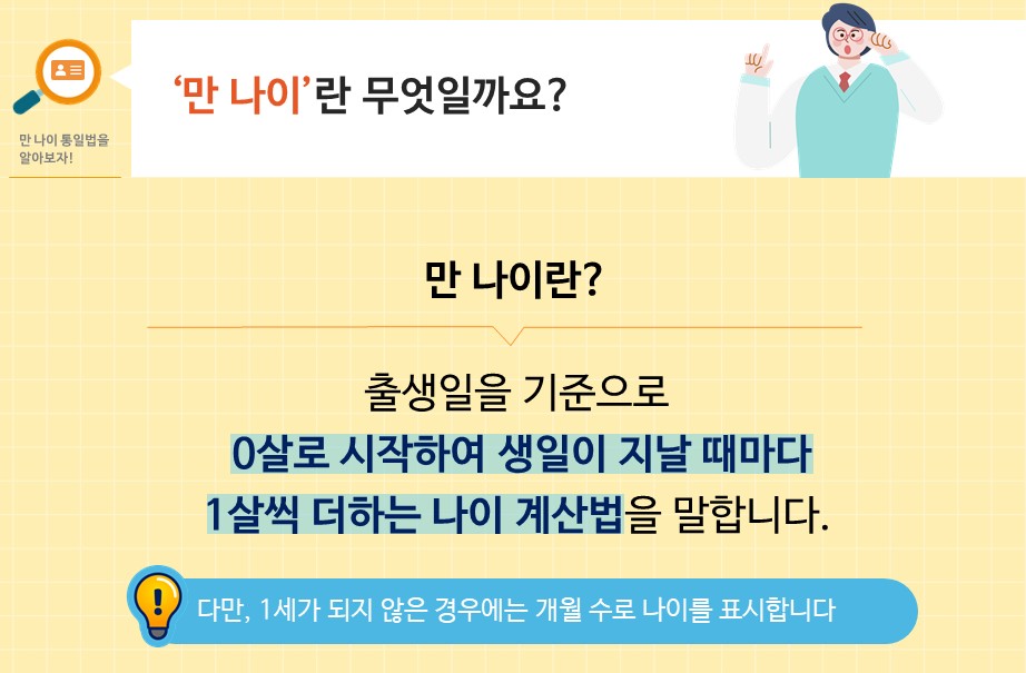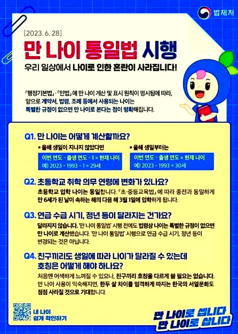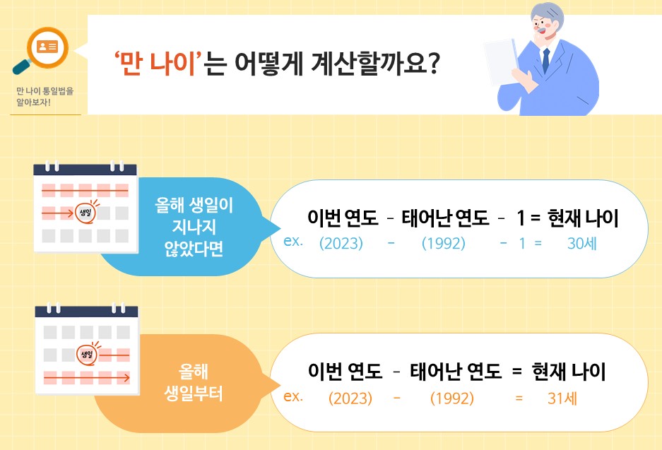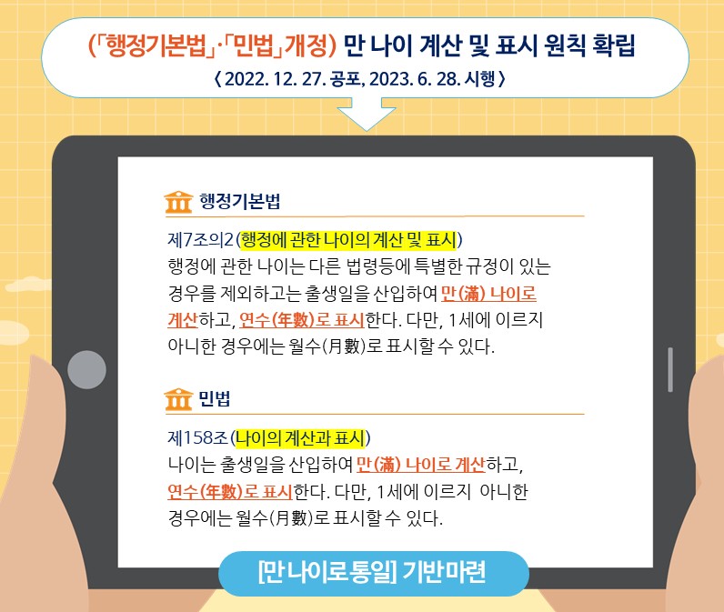 지난 6월부터 적용된 만난이 통일법 시행으로 인해 전 국민의 법적, 사회적 나이가 1~2살이 어려지게 되었습니다. 이는 개정된 행정기본법과 민법으로 나이를 통일하도록 되어있기 때문입니다. 만나이 계산기를 통해 계산되는 방법과 적용범위에 대해 정리해 보겠습니다.