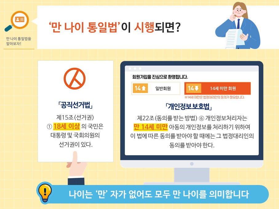 만나이 통일법이 시행이 되면 개인정보보호법에 따라 만 14세 미만의 아동의 개인정보를 이용하기 위해서는 법적 대리인의 동의를 받아 진행해야 합니다.