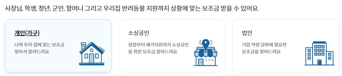 보조금 24 홈페이지 메뉴에서 [간편 찾기]를 누르면 개인, 소상공인, 법인 등 상황에 맞는 지원금을 확인할 수 있습니다.