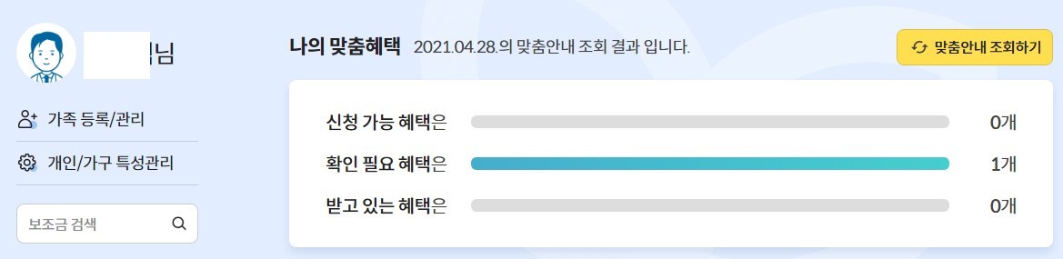 정보 이용 동의를 마치면 아래와 같이 나의 맞춤혜택 결과를 확인할 수 있습니다. 저는 확인이 필요한 혜택은 1개라고 나오는군요.