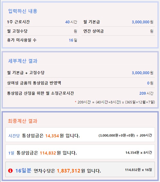 계산하기를 클릭하고 화면을 아래로 내리시면 세부적인 연차수당을 확인할 수 있습니다.