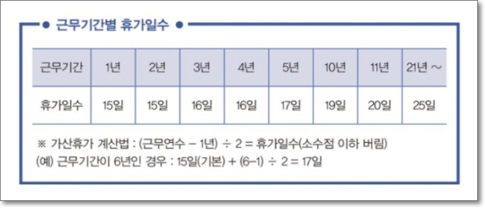 - 3년 이상 계속하여 근로한 근로자에게는 휴가에 최초 1년을 초과하는 매 2년마다 1일씩 가산된 유급휴가가 주어집니다. 이 경우 가산휴가를 포함하여 휴가 일수는 총 25일을 한도로 합니다.