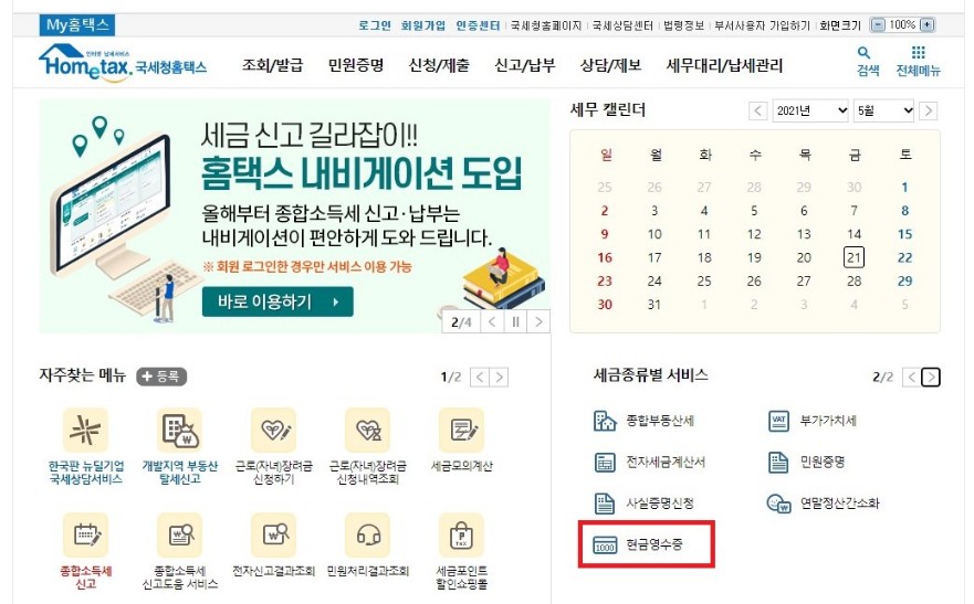 먼저 현금영수증 홈페이지 조회를 이용하려면 국세청 홈택스 홈페이지에 접속을 하여 인증서 로그인을 거친 후 이용할 수 있습니다.