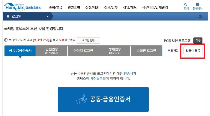 공동/금융인증서로 로그인하려면 해당 인증서가 홈택스에 사전 등록되어 있어야만 이용할 수 있습니다. 만약 인증서 등록이 안되어 있다면 오른쪽 화면 끝에 [PC용 보안 프로그램] 아래에 인증서 등록을 클릭하여 등록 후 로그인하시기 바랍니다.